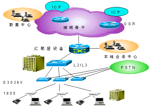 在用戶接入層Quidway S3026V提供24路VDSL接入,在普通雙絞線上提供12Mbps的雙向對稱數(shù)據(jù)業(yè)務,傳輸距離最大可達1500m,在完成以太網(wǎng)接入的同時,不影響POTS業(yè)務。S3026V上行FE接口直接接入L3交換機。同時,通過雙絞用戶線完成了與PSTN交換機的相連,將寬帶、窄帶業(yè)務在S3026V上匯合,并通過已有雙絞電話線連接至遠端用戶設備(1805)。1805可以通過五類線與計算機網(wǎng)卡相連。