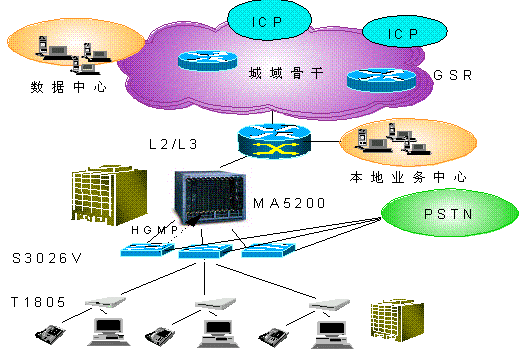 另外,Quidway S3026V可與華為公司MA5200等組網(wǎng),通過HGMP(Huawei Group Management Protocal)華為組管理協(xié)議,S3026V與華為MA5200、S3526等上行管理設備共同提供寬帶接入網(wǎng)的整網(wǎng)解決方案,實現(xiàn)對Quidway(R) S3026V的集中管理,為用戶提供更廣泛、更豐富的業(yè)務功能,充分體現(xiàn)華為公司在寬帶網(wǎng)絡上具有的“可運營、可管理、可維護”優(yōu)勢。 如圖2所示: