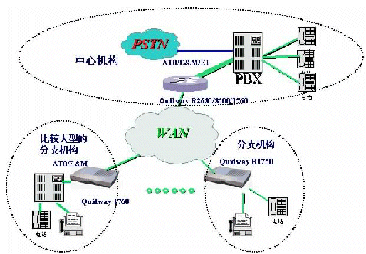 。。如圖是一個典型的企業(yè)網(wǎng)IP電話組網(wǎng)方案,在總部采用Quidway®R3640E/3680E路由器作為中心語音網(wǎng)關(guān)設(shè)備,在E1線路上實現(xiàn)VoIP功能;如果機(jī)構(gòu)規(guī)模不是很大,也可以采用AT0/E&M連接PBX;在各分支機(jī)構(gòu)及網(wǎng)點,則可采用Quidway®