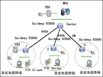 對(duì)于視頻的互通,則采用專用的視頻網(wǎng)關(guān),在中心處配置一臺(tái)MCU作為整個(gè)網(wǎng)絡(luò)視頻系統(tǒng)的管理者,1、2、3節(jié)點(diǎn)則配置具有視頻網(wǎng)關(guān)功能的視頻終端。在網(wǎng)上召開視頻會(huì)議時(shí),各會(huì)場(chǎng)的加入和畫面的調(diào)度都由位于中心的MCU進(jìn)行控制。通過(guò)視頻網(wǎng)關(guān)壓縮的圖像的帶寬為512kbps。