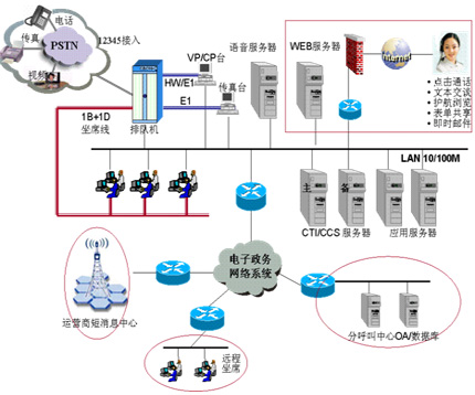 針對(duì)政府目前熱線電話眾多,管理不規(guī)范,資源無法共享的問題,華為公司提出的基于資源整合理念的解決方案,采用華為公司呼叫中心技術(shù)構(gòu)建完整的計(jì)算機(jī)電信集成(CTI)系統(tǒng)體系,并充分利用政府現(xiàn)有的信息網(wǎng)絡(luò)資源,一方面整合原有分散的熱線,啟用12345政府熱線號(hào)碼統(tǒng)一接入;另一方面將自動(dòng)語音查詢、人工服務(wù)、信息資料處理緊密結(jié)合起來,依托地方政府各類業(yè)務(wù)技術(shù)支持系統(tǒng)和網(wǎng)絡(luò)系統(tǒng),建立一套通暢的來電業(yè)務(wù)公文流轉(zhuǎn)系統(tǒng),通過人工受理或自動(dòng)語音服務(wù)等方式,為人民群眾提供全天候24小時(shí)不間斷的服務(wù)。最終整合現(xiàn)有的全部政府部門政府熱線資源,使政府政府熱線服務(wù)范圍覆蓋到政府公共服務(wù)的全部領(lǐng)域,為市民提供全方位、全天候、高效率的政府政府熱線服務(wù),市民只記一個(gè)電話號(hào)碼,只打一次電話,就能得到政府答復(fù)和服務(wù)。