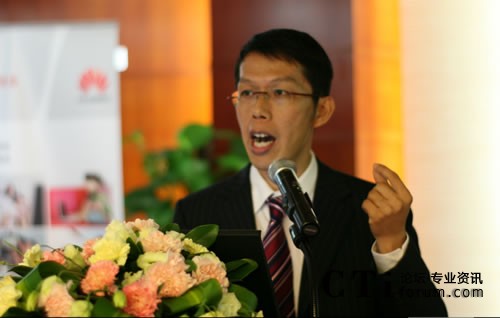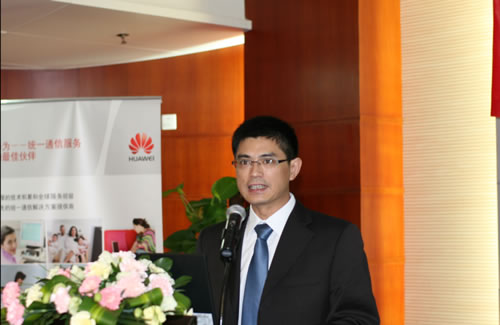 圖:華為軟件UC產(chǎn)品總監(jiān)許國華做“攜手邁入全業(yè)務融合時代,助力企業(yè)騰飛”的主題演講