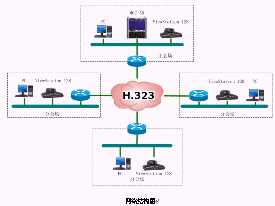 結(jié)合遼寧省消防網(wǎng)絡(luò),本方案設(shè)計的視頻會議系統(tǒng)承載在遼寧省消防局的IP網(wǎng)絡(luò)平臺上,采用國際流行的ITU H.323通信標準。系統(tǒng)采用以MCU為中心輻射各個會場電視會議終端的星型網(wǎng)絡(luò)結(jié)構(gòu)。整套系統(tǒng)由16個會場組成,采用美國Polycom公司的ViewStation 128會議室型終端設(shè)備。網(wǎng)管中心安放一臺Polycom 公司的MGC-50(多點會議控制單元),用于對全網(wǎng)終端的控制,實現(xiàn)多點、點對點的會議。
