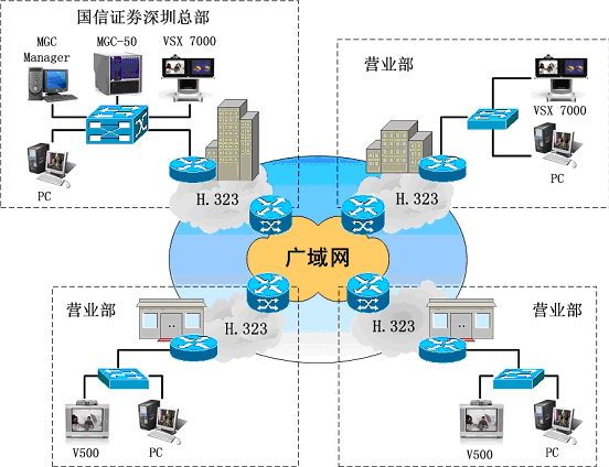 國(guó)信證券有限責(zé)任公司為全國(guó)性大型綜合類證券公司,總部在深圳,在全國(guó)二十一個(gè)城市擁有二十多家營(yíng)業(yè)部及服務(wù)網(wǎng)點(diǎn)。隨著國(guó)信證券規(guī)模的不斷擴(kuò)大和內(nèi)外交流的增加,公司領(lǐng)導(dǎo)希望借助視頻會(huì)議的高效、快捷等特點(diǎn),提高管理效率、統(tǒng)一管理、降低企業(yè)的管理運(yùn)作成本、減少公司的巨額通訊費(fèi)用和差旅費(fèi)用。