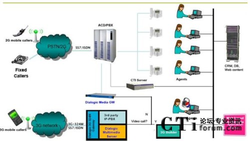 Bridge與web server連接,3G Bridge起的主要作用就是把web上的http轉(zhuǎn)換成RTP\RTSP文件,這樣就完成了web與3G手機(jī)的互動,同樣的,如果您想和傳統(tǒng)的呼叫中心互聯(lián)互通,只需要用Dialogic的媒體服務(wù)器做連接,就可以把3G與2G