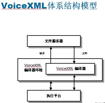 VoiceXML設計的工作原理:語音應用程序作為系列頁存儲在類似于網(wǎng)絡服務器的文件服務器上。從實現(xiàn)平臺接收到輸入呼叫時,VoiceXML編譯程序會向文件服務器發(fā)出一個特定URL請求,就像用戶瀏覽網(wǎng)絡時輸入網(wǎng)站地址一樣。文件服務器可以與編譯程序直接相連,也可以設置在外部,通過本地網(wǎng)或互聯(lián)網(wǎng)的IP協(xié)議訪問。他們可以保持應用程序的服務邏輯,可以提供數(shù)據(jù)庫查找與其他系統(tǒng)操作功能。