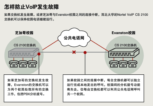 美國西北大學原來的兩臺運營商級SL-100電話交換機(一臺安裝在芝加哥校園,一臺安裝在Evanston校園)已經(jīng)用了差不多20年。升級的目標是將兩臺獨立的交換機合并為一臺邏輯交換機來減少管理復雜性。同時,不必更換全部數(shù)字電話。最終他們決定升級到同時支持VoIP和TDM的Nortel CS 2100 VoIP,這樣用戶不用被迫把他們的電話換為VoIP電話。Carr說:“不管是那些希望利用VoIP性能的用戶,還是想繼續(xù)使用當前電話特性和服務(wù)的用戶,可以各取所需!