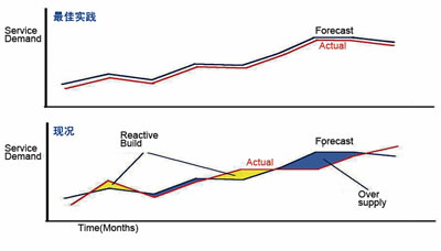 下一代網(wǎng)絡(luò)的IP化、智能化的趨勢,使得服務(wù)路徑從靜態(tài)路由為主向動態(tài)化、共享化轉(zhuǎn)變。這種轉(zhuǎn)變使得主動的網(wǎng)絡(luò)容量規(guī)劃在下一代運營環(huán)境中具有更加重要的意義。準確、真實、主動的網(wǎng)絡(luò)容量計劃和趨勢分析能力將成為對OSS解決方案的關(guān)鍵需求。網(wǎng)絡(luò)規(guī)劃不僅可以幫助運營商準確分配網(wǎng)絡(luò)容量,而且可以減少容量不足和失敗訂單,并可通過找出利用率不足的網(wǎng)絡(luò)資源來提高網(wǎng)絡(luò)運行效率,如圖3所示。
