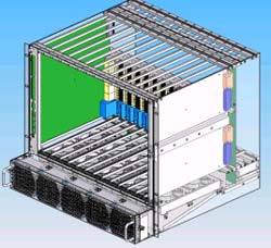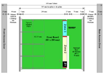 我們可以看到當(dāng)今市面上已有相關(guān)的零件商或系統(tǒng)商開發(fā)出14U或13U,12U的ATCA機(jī)箱。就ATCA機(jī)箱的型式來說可以分為直立型插卡與橫向型插卡兩種類型。直立式插卡機(jī)箱的標(biāo)準(zhǔn)為14槽(參考圖一B),而橫向型機(jī)箱因受限于機(jī)箱高度,所以視其高度決定槽數(shù)的多少。