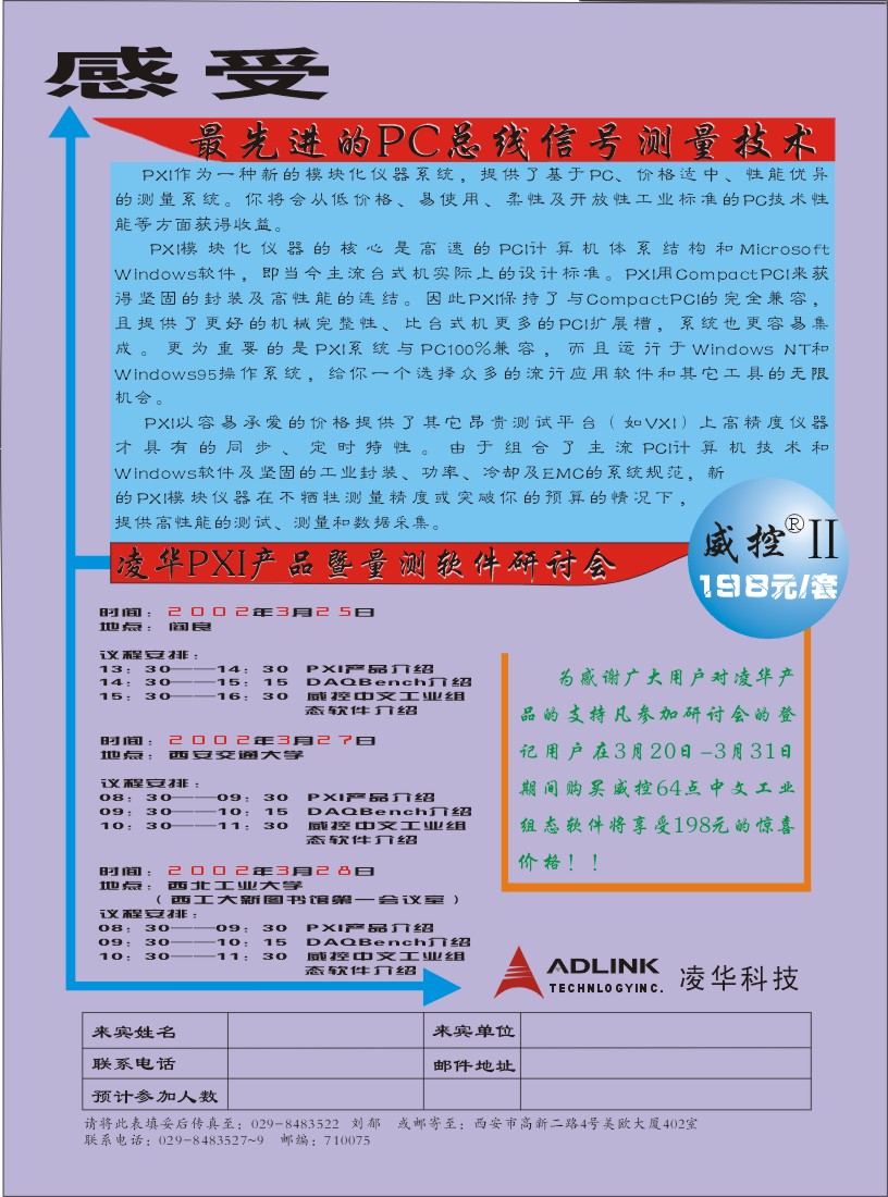 從以下凌華產品的發(fā)展進程您會更加了解凌華在技術上的快速成長。1996我們在亞洲第一個發(fā)布基于PCI總線的采集卡PCI9112,并隨后推出20MHz的4通道并行A/D采集卡PCI9812。目前該系列產品已經有3大類百余種產品。在1998年凌華以敏銳的技術目光洞察到CompactPCI總線將是未來量測與通訊產品的最佳平臺,于是迅速的成立了CompactPCI產品研發(fā)中心,并在最短的時間里推出了3U的CompactPCI量測平臺CPCIS2000。該產品獲得臺灣精品標志。隨后研發(fā)的6U CompactPCI平臺目前已廣泛的應用到CTI、IP電話網關等通訊產品。