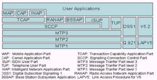 圖中MAP,CAP,RANAP,BSSAP為移動通信系統(tǒng)使用的信令;ISUP,TUP,INAP為固定網(wǎng)使用的信令;DSS1和V5.2為接入網(wǎng)使用的信令。