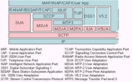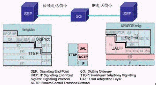 圖中粉紅色部分為SIGTRAN的協(xié)議棧,在它們之上的是對應的電話信令協(xié)議。SIGTRAN的協(xié)議棧分為2層:一層是SCTP,它提供多個流的,可靠的數(shù)據(jù)傳輸,用戶數(shù)據(jù)的捆綁和分段,阻塞和流量控制,防止"拒絕服務"和"偽裝"的攻擊等功能。另一層是用戶適配層,圖中由SUA、M3UA、M2UA、M2PA、IUA和V5UA五個適配模塊所組成,它們分別來滿足各種電話信令協(xié)議適配的要求。