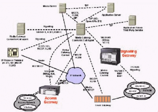 本例中的媒體網(wǎng)關(guān)控制器(MGC)終結(jié)所有的信令,包括直接傳輸?shù)暮屯ㄟ^IP的信令,完成如一個SIP電話向PSTN網(wǎng)絡(luò)發(fā)送信號之類的信令互通,還對打到VoIP網(wǎng)絡(luò)的呼叫進行鑒權(quán)和選擇路由,并提供計費信息。這個MGC還通過SIP/SIP-T,H.323或Q.BICC與其他的MGC通信。