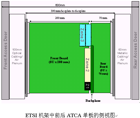 PICMG 3.0機構(gòu)要求主要來自于對600mm ETSI 和19" EIA標(biāo)準(zhǔn)機柜空間使用的研究。PICMG 3.0委員會在考慮單板尺寸能支持下一代元器件對物理和散熱的需求的同時,機箱空間能和板子能達到最大限度的配合和利用。最初的工作是基于歐規(guī)卡的標(biāo)準(zhǔn),繼而又提升到支持低成本的片狀金屬架構(gòu)(簡單電訊封裝)。對后走線模塊的支持滿足了對后I/O應(yīng)用的需求。在決定可以使用的單板空間時,也充分考慮了前、后板的進深范圍以供大量電纜束綁空間。經(jīng)過對不同規(guī)格尺寸的單板的優(yōu)點進行討論之后,PICMG 3.0組織統(tǒng)一規(guī)格如下:前板 8U x 280mm,進深1.2" pitch,選配后板8U x 70mm深;1.2" pitch,19" EIA機框可以支持14槽,而600mm ETSI的機框可以支持16槽。下圖所示為600mm ETSI機架中的ACTA前后單板的側(cè)視圖:
