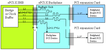 由于加了PCI-X,底板上的時(shí)鐘的長度就成為關(guān)鍵了。規(guī)范的作者要定義應(yīng)能與各種底板互操作的SHB。這挑戰(zhàn)是在SHB上的PCI-X接口需要一個(gè)具有相等于底板上時(shí)鐘走線長度延時(shí)的反饋時(shí)鐘。這反饋時(shí)鐘是在底板上并且它的長度是以從SHB插槽到PCI插板插槽的時(shí)鐘的長度為基礎(chǔ)的。在下面畫的圖中,從橋到三個(gè)目的地中任何一個(gè)的時(shí)鐘距離是相同長度的。