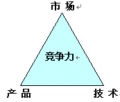 企業(yè)要發(fā)展, 關(guān)鍵于企業(yè)的核心競爭力, 企業(yè)如何具有核心競爭力, 特別是通信企業(yè), 我認(rèn)為, 通信企業(yè)要具有核心競爭力, 決定于三個因素: 市場, 產(chǎn)品, 技術(shù). 這三個因素構(gòu)筑企業(yè)強大競爭力---競爭力三角型. 三角型的邊則是產(chǎn)品經(jīng)理的活動軌道. 圖1-1