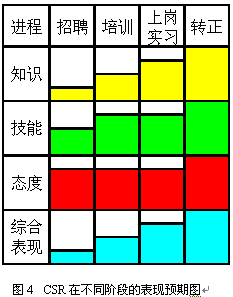 即使經(jīng)過規(guī)范的上崗培訓(xùn)與考核,新員工通常也只達到老員工70%左右的表現(xiàn)。因此制定明確的實習期,在實習期間加強指導(dǎo)和培養(yǎng)是非常重要的。通常經(jīng)過3個月的實習,新員工已經(jīng)可以達到一個標準,這時便可以轉(zhuǎn)正了。圖3和圖4表現(xiàn)了不同階段對CSR的不同預(yù)期,以及不同階段的主要工作。