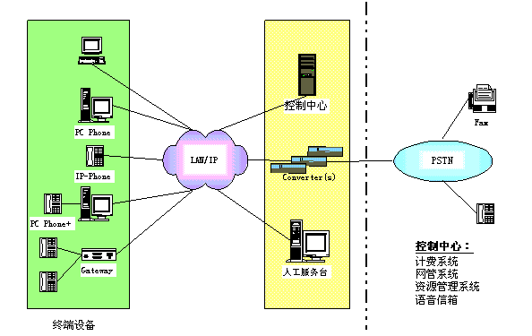 控制中心:包括資源管理系統(tǒng)、計費系統(tǒng)、網(wǎng)管系統(tǒng)、語音信箱。 其中,資源管理系統(tǒng)主要執(zhí)行地址翻譯、權(quán)限控制、路由管理等功能;計費系統(tǒng)主要完成計費及結(jié)算功能;網(wǎng)管系統(tǒng)完成對網(wǎng)絡(luò)及IP PBX運行的維護(hù)管理