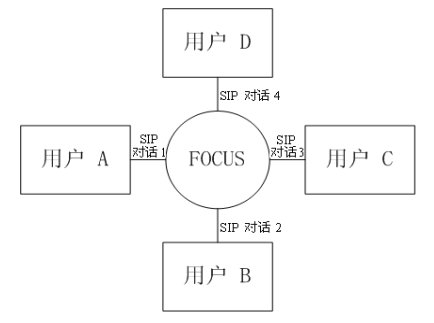 緊耦合會議的邏輯架構圖如圖三所示。會議中的核心是“會議中心(conference focus)”,每一個會議都有一個會議中心,由一個URI標識,用戶通過聯系這個URI參加到一個會議中去。會議中心和用戶之間的拓撲結構為星性結構。會議中心為用戶提供并維持一個信令連接,并且可以執(zhí)行會議策略,實現對會議的控制和管理。