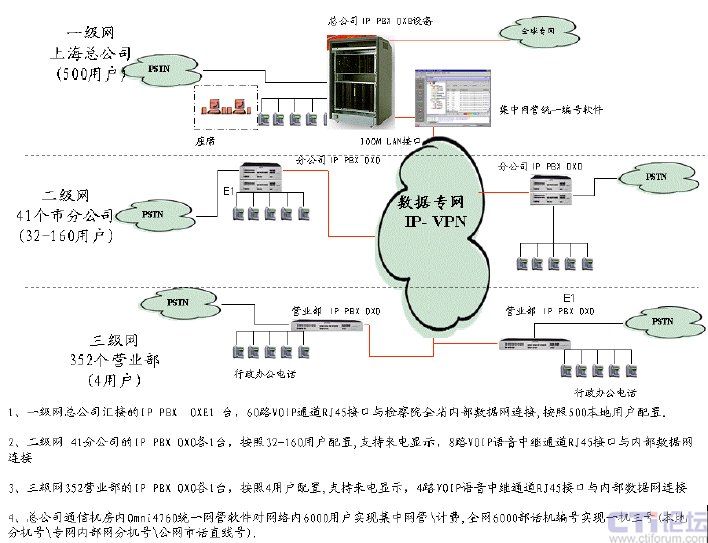 套Omni PCX Office(面向中小型機(jī)構(gòu)的通信平臺)系統(tǒng)分別為4-160 用戶作為分支交換節(jié)點。全網(wǎng)總計多達(dá)6000