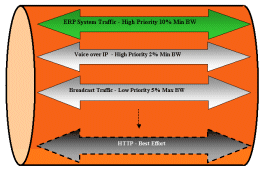 在上例中,在一個千兆端口上,為關(guān)鍵性應(yīng)用ERP預(yù)留了嚴格的10%的帶寬資源;為Voice Over IP的應(yīng)用預(yù)留了嚴格的2%的帶寬資源;為低優(yōu)先級的廣播流量預(yù)留了最大5%的帶寬資源,……….為HTTP應(yīng)用僅定義為最為普通的Best Effort。