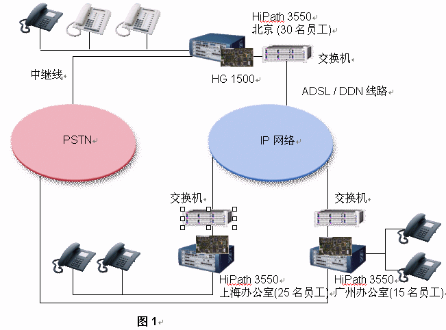 西門子推薦該公司每一個辦公室均采用HiPath 3550 PBX。如果,A公司每個辦公室已經(jīng)擁有DDN專線或ADSL連接至Internet,它就能將其內(nèi)部通信建設在現(xiàn)存的IP網(wǎng)絡的基礎之上。其集成網(wǎng)關(guān)HiPath 1500被用來連接數(shù)據(jù)網(wǎng)絡和語音網(wǎng)絡。在這樣的網(wǎng)絡架構(gòu)中,路由冗余能夠得到充足的保證,因為西門子HiPath解決方案提供了最大的網(wǎng)絡存活性:即使IP網(wǎng)絡出現(xiàn)故障,西門子網(wǎng)絡設置能夠?qū)⒙酚勺詣忧袚Q至PSTN之上。