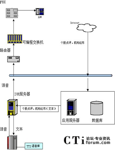 技術(shù)實(shí)現(xiàn)上,證券交易所可從網(wǎng)上下載個(gè)股點(diǎn)評(píng)信息或熱門個(gè)股信息,之后將這些信息的文本傳遞給IVR服務(wù)器,IVR會(huì)通過調(diào)用TTS服務(wù)器得到這些信息的語音流,之后就可以在坐席上播放這些信息的語音了。如圖所示: