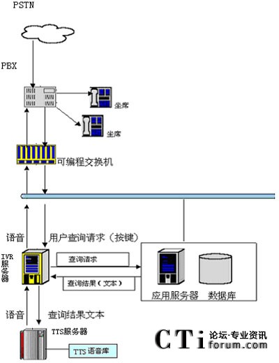 在技術(shù)上,用戶可以通過電話提交他的查詢請(qǐng)求(比如使用按鍵方式),IVR服務(wù)器收到請(qǐng)求后會(huì)向其他應(yīng)用服務(wù)器提交此查詢請(qǐng)求,當(dāng)IVR得到查詢結(jié)果后,他會(huì)將文本形式的查詢結(jié)果交給jTTS服務(wù)器,jTTS服務(wù)器會(huì)返回查詢結(jié)果的語音形式,最終語音會(huì)在坐席上播放,用戶就可以聽到他剛才所要查詢的信息。(如圖所示)