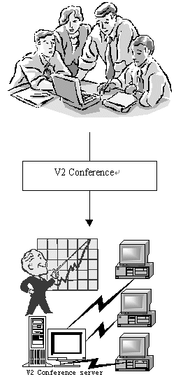 I P視頻會議,是一種利用普通的PC機加上簡單的視頻攝像頭和耳機麥克風(fēng),通過Internet或者是局域網(wǎng)進(jìn)行傳輸,以低廉的成本傳送數(shù)據(jù)、視頻和音頻信號的新型會議方式。V2公司的視頻會議產(chǎn)品V2 Conference 就采用了這種技術(shù)先進(jìn)而且經(jīng)濟合算的方式,與傳統(tǒng)的需要專用的服務(wù)器和硬件支持的視頻會議相比,該系統(tǒng)可以使您無需進(jìn)行成本高昂的投入,就實現(xiàn)高質(zhì)量、高可靠性的音視頻通訊。同時,為了方便您的管理,V2 Conference提供了會議管理的功能,使您足不出戶,就可以掌控全局。