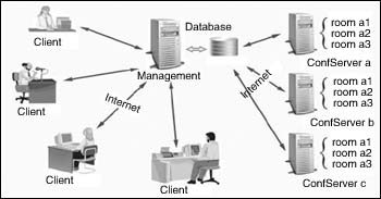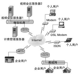 用戶可通過從56K撥號上網(wǎng)直至寬帶等各種方式接入該視頻會議系統(tǒng),包括PSTN撥號、ISDN撥號、ADSL撥號、LAN、PLC(低壓電力載波)等各種形式,在這個(gè)統(tǒng)一的視頻會議平臺上,實(shí)現(xiàn)多路音頻、多路視頻、文檔共享、電子白板、協(xié)同瀏覽、文件傳輸、文字交流等功能。系統(tǒng)的拓?fù)浣Y(jié)構(gòu)圖如左所示。