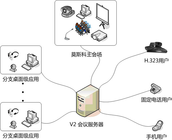 俄羅斯百事可樂公司莫斯科總部和俄羅斯其它各地分支機(jī)構(gòu)通過公眾互聯(lián)網(wǎng)連接,以V2視頻會議系統(tǒng)為紐帶,將不同的參會用戶連接在一起,實現(xiàn)即時的音視頻溝通及數(shù)據(jù)協(xié)作。不僅是普通的PC機(jī)用戶,包括傳統(tǒng)H.323用戶,手機(jī)和固定電話用戶等都可以加入V2視頻會議。