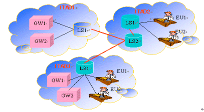 圖中的紅線是TRIP協(xié)議控制下的各個域中網(wǎng)關(guān)路由信息在LS之間被聚合、被交換、被廣播、被同步的路徑。各個ITAD管理者首先簽訂適用于交互網(wǎng)關(guān)信息的TRIP協(xié)議,然后通過管理手段建立起這些信息共享的聯(lián)合體,一個域中的LS同其它域中的LS都成為聯(lián)合體的一員,于是這些LS通過這種方式就可以交換網(wǎng)關(guān)信息了。在圖中,ITAD1的LS1與ITAD2的LS1相連,ITAD2的LS2又依次與ITAD3的LS1相連通,通過TRIP協(xié)議,ITAD2的LS2就可以了解ITAD1上的兩個網(wǎng)關(guān),這兩個網(wǎng)關(guān)的網(wǎng)關(guān)路由信息就可以由ITAD2的終端用戶通過其前端(front-end)進(jìn)行訪問。在ITAD3中,既有終端用戶,又有網(wǎng)關(guān),ITAD3的LS1通過ITAD2上LS2已經(jīng)聚合后的廣播消息來了解ITAD1上的網(wǎng)關(guān)。