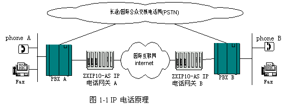 普通電話的基本流程是:用戶在phone A要打長途電話到phone B,語音從phone A到PBX A,通過PSTN網(wǎng),經(jīng)PBX B到phone B。而IP電話的基本流程為:用戶在phone A要打長途電話到phone B,語音經(jīng)PBX A傳到網(wǎng)關(guān)A。在網(wǎng)關(guān)A對語音進(jìn)行處理,打成可在IP網(wǎng)絡(luò)傳輸?shù)恼Z音包。由IP網(wǎng)絡(luò)將語音包傳給網(wǎng)關(guān)B,網(wǎng)關(guān)B對語音包進(jìn)行處理,還原為語音,經(jīng)PBX B傳到phone B。IP 電話原理見圖1-1。