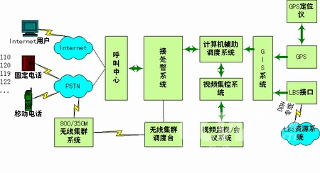 本系統(tǒng)實(shí)現(xiàn)接警、處警功能。接警中心統(tǒng)一接聽和處理市民的報(bào)警、求助電話,市民可以通過電話撥打110、119、120、122等緊急特服號碼或只撥打統(tǒng)一的特服號碼(或通過Internet方式)向系統(tǒng)求助;處警中心接收接警中心轉(zhuǎn)發(fā)的警情數(shù)據(jù),并借助地理信息系統(tǒng)的定位、空間分析功能,對所有的資源和警力通過一體化的數(shù)據(jù)傳輸和通訊調(diào)度臺進(jìn)行方便的統(tǒng)一管理、指揮和調(diào)度。