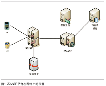 ZXASP:中興短消息增值業(yè)務平臺,是一個位于SMSC后端的增值業(yè)務邏輯控制處理網(wǎng)元,它為用戶提供新型短信增值業(yè)務開戶、銷戶以及業(yè)務使用流程控制支持等相關(guān)功能。核心網(wǎng)元ZXASP分別與短信中心、營帳系統(tǒng)以及預付費系統(tǒng)進行連接,以實現(xiàn)對用戶簽約多種增值業(yè)務情況下的服務支持。如圖1。