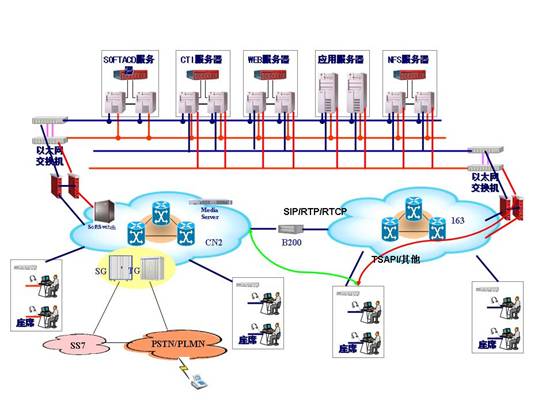 客戶座席可以分布在不同的地點(diǎn),集中在電信機(jī)房的座席可以直接部署到CN2網(wǎng)上,分布在客戶處的座席,可以部署在各地市專網(wǎng)上或者163城域網(wǎng)上。部署在163網(wǎng)和專網(wǎng)上的座席,語音流和SIP協(xié)議通過寬帶接入網(wǎng)關(guān)