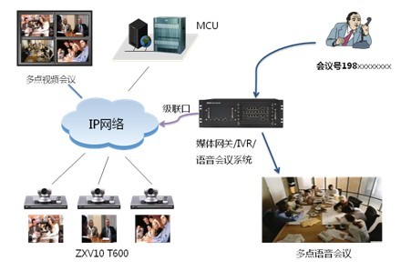 在需要語音電話接入的視頻會(huì)議中, MCU業(yè)務(wù)系統(tǒng)將分別在MCU和語音網(wǎng)關(guān)上召開兩個(gè)會(huì)議:以視頻終端為主的多點(diǎn)視頻會(huì)議、純語音多點(diǎn)會(huì)議,語音會(huì)議以一個(gè)H.323終端的形式加入到MCU會(huì)議中,實(shí)現(xiàn)兩個(gè)會(huì)議的音頻互通。