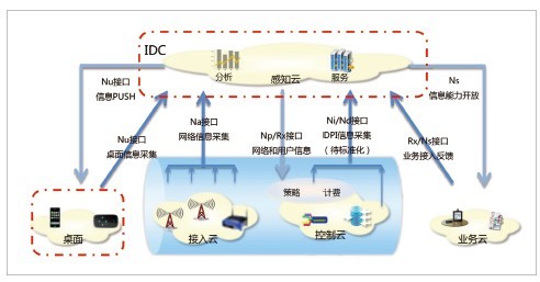 中興通訊增強(qiáng)端到端信息感知和開放接口,提出一套標(biāo)準(zhǔn)架構(gòu)如圖2所示,來實(shí)現(xiàn)整個(gè)網(wǎng)絡(luò)透明、可視。建設(shè)網(wǎng)絡(luò)信息采集體系,增強(qiáng)感知云的端到端分析能力;建立“桌面云-感知云”的云端一體化架構(gòu),提供網(wǎng)絡(luò)推送能力;感知云向終端開放網(wǎng)絡(luò)信息和能力,增強(qiáng)用戶感知網(wǎng)絡(luò)、定制個(gè)人體驗(yàn)?zāi)芰Γ桓兄葡驑I(yè)務(wù)開放網(wǎng)絡(luò)信息和能力,拓展合作發(fā)展增值業(yè)務(wù)的能力。