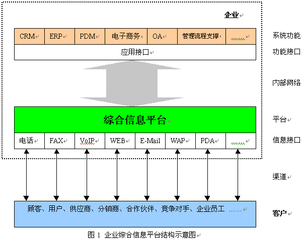 企業(yè)綜合信息平臺(tái)是一個(gè)完全從客戶出發(fā),并能更好地為客戶服務(wù)的一個(gè)平臺(tái)。這里我們所指的“客戶”是一個(gè)廣義的概念,綜合信息平臺(tái)的客戶不僅包括企業(yè)的客戶、用戶,而且還包括企業(yè)內(nèi)部的員工、企業(yè)的供應(yīng)商、分銷商及合作伙伴,甚至還包括企業(yè)的競爭對(duì)手。綜合信息平臺(tái),保證了企業(yè)內(nèi)部之間、企業(yè)與客戶之間的信息流得到暢通、高效的處理,可以高效、高質(zhì)量地為客戶服務(wù),提高客戶的滿意度和忠誠度,同時(shí)使企業(yè)內(nèi)部的信息實(shí)現(xiàn)共享,并能支撐企業(yè)信息化各環(huán)節(jié)對(duì)客戶數(shù)據(jù)的依賴,為企業(yè)信息化建設(shè)提供了一個(gè)開放性的平臺(tái)。