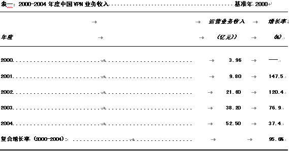 2000年,中國(guó)VPN運(yùn)營(yíng)業(yè)務(wù)收入為人民幣3.96億元,主要業(yè)務(wù)提供商為新興的電信運(yùn)營(yíng)商如網(wǎng)通、吉通、聯(lián)通等公司,以及數(shù)量可觀的或明或暗的網(wǎng)絡(luò)公司,VPN用戶主要集中在規(guī)模較大的外企、金融領(lǐng)域以及與IT相關(guān)的企業(yè)之中。隨著更多的虛擬運(yùn)營(yíng)商進(jìn)入VPN服務(wù)市場(chǎng),以及企業(yè)成本意識(shí)的不斷增強(qiáng),VPN用戶群體已經(jīng)呈擴(kuò)散之勢(shì),制造業(yè)、FMCG連鎖經(jīng)營(yíng)業(yè)、酒店業(yè)等已經(jīng)迅速進(jìn)入這一市場(chǎng)。預(yù)計(jì)到2004年度,國(guó)內(nèi)VPN業(yè)務(wù)收入可以達(dá)到52.5億元人民幣,年復(fù)合增長(zhǎng)率為95.6%。各年度測(cè)算數(shù)據(jù)見(jiàn)表一。