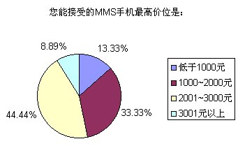 題7對(duì)終端提供商在定價(jià)方面很有幫助的,A~D的答案被選幾率分別為13.33%、33.33%、44.44%和8.89%,看來(lái)1000~3000元的價(jià)位是用戶(hù)關(guān)注的焦點(diǎn),相對(duì)于現(xiàn)在的市場(chǎng)狀況,終端廠商在將來(lái)MMS上面的競(jìng)爭(zhēng)環(huán)境還是比較友好的,至少價(jià)格上處于買(mǎi)方市場(chǎng),可以預(yù)計(jì)當(dāng)MMS投入運(yùn)營(yíng)的頭半年,MMS終端將維持在2500~3500元以上的檔次,6~12個(gè)月以后才會(huì)真的降到2500以?xún)?nèi)去迎合尋常百姓的消費(fèi)能力。