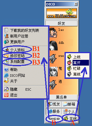 1、在線狀態(tài)設(shè)置:點按主窗口右下角(圖3的A處)后,可選擇"上線/離開/忙碌/離線"四種在線狀態(tài)之一;