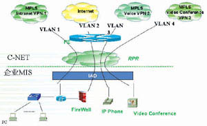 VPN中,實現(xiàn)業(yè)務在VLAN 和VPN中的無縫對接,以保證用戶數(shù)據(jù)的安全、高效傳輸;接入網(wǎng)采用基于RPR或SDH的MSPP環(huán)實現(xiàn)IP業(yè)務和TDM業(yè)務的綜合傳輸;在商業(yè)樓宇內(nèi)主要采用IAD設備將客戶的數(shù)據(jù)、語音、專線等業(yè)務接入CNC