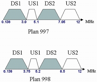 VDSL使用的頻譜較寬,最高可達12 MHz 。這一頻譜范圍可被分割為若干下行(DS)和上行(US)頻段,國際上常用的頻段劃分方式(Band