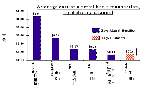 ·降低銀行經(jīng)營成本,提高贏利能力:開展手機銀行服務(wù)可以有效降低銀行經(jīng)營成本。據(jù)國外金融研究機構(gòu)(Booz Allen & Hamilton/Logica Estimate)調(diào)查結(jié)果(如下圖所示)表明:利用手機銀行處理每一筆交易的平均成本為0.16美元,大大降低于1.07美元的傳統(tǒng)柜員交易成本(比柜員成本低85%)。按國內(nèi)目前平均柜臺交易成約為人民幣4元進(jìn)行推算,使用移動交易的成本為0.6元人民幣。