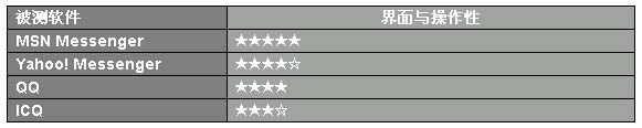 對(duì)于IM類軟件來說,網(wǎng)友希望其界面在精美的同時(shí)越簡(jiǎn)單越直接越好。在這一點(diǎn)上,MSN Messenger最為突出,界面精致,操作極易上手,在本次評(píng)測(cè)中獲得一致認(rèn)可,位列第一;Yahoo! Messenger操作上也比較直觀,只是“做工”顯得有些粗糙;被測(cè)的QQ2003剛剛在界面上做了重大的改變,只是稍顯零亂,對(duì)MSN的部分借鑒比較成功,對(duì)于一個(gè)新用戶來說最基本的功能的使用還算方便;ICQ功能的確強(qiáng)大,界面有些老舊,(ICQ Lite可以改變這一切,但是ICQ Lite僅僅是ICQ的一個(gè)插件版本,本次評(píng)測(cè)沒有考慮),ICQ操作對(duì)中文用戶來說也過于繁復(fù)。
