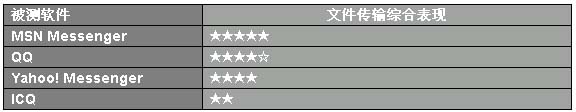 評(píng)測(cè)傳輸結(jié)果表明,MSN Messenger 6.0穿防火墻的能力很強(qiáng),而且傳輸速度還不錯(cuò);QQ的速度與MSN Messenger相當(dāng),但防火墻穿越能力和傳輸穩(wěn)定性上略遜一籌;Yahoo! Messenger對(duì)50M的文件好像有點(diǎn)消化不良;ICQ的傳輸成功率幾乎為20%,成功后效果也不盡如人意。