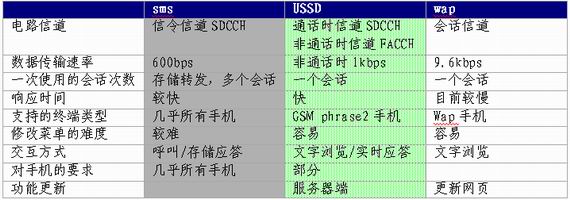 最后,根據(jù)上述分析給出SMS、USSD、WAP三者異同點(diǎn)的列表,如下表所示。