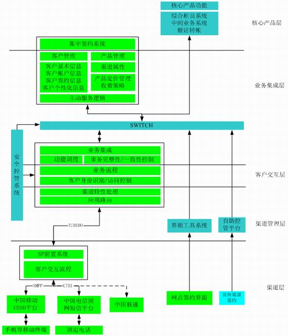 3) SP前置系統(tǒng)實(shí)際包括兩個(gè)部分:一是針對(duì)具體渠道的協(xié)議轉(zhuǎn)換,二是對(duì)簽約系統(tǒng)中制定的產(chǎn)品要素流程的具體交互控制。由于USSD接入模式的特性(面向?qū)崟r(shí)連接)和手機(jī)終端表達(dá)能力的限制,客戶在手機(jī)上對(duì)每個(gè)產(chǎn)品的每個(gè)交互步驟的控制均由SP前置系統(tǒng)控制。在設(shè)計(jì)和實(shí)施中除去與移動(dòng)USSD平臺(tái)的SMPP協(xié)議轉(zhuǎn)換部分,SP前置實(shí)際上是一個(gè)通用的交易交互流程控制系統(tǒng),能夠保持客戶在具體渠道終端上的交易流程狀態(tài),并交互式的向渠道終端提供交易序列。SP前置的交互流程控制通過(guò)與不同渠道的內(nèi)容管理組件的配合,可以提供基于文本、語(yǔ)音、圖形、圖象等不同表現(xiàn)形式的業(yè)務(wù)流程,可以方便的將業(yè)務(wù)集成系統(tǒng)包裝的產(chǎn)品實(shí)現(xiàn)在諸如多媒體終端、電話銀行、電視銀行等渠道上。
