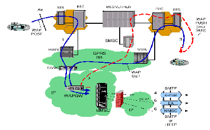 ·圖中第一條消息流顯示了多媒體消息由BTS、BSC、SGSN和GGSN到達(dá)IP網(wǎng)絡(luò),通過(guò)WAP Gateway被轉(zhuǎn)發(fā)到MMSC中。